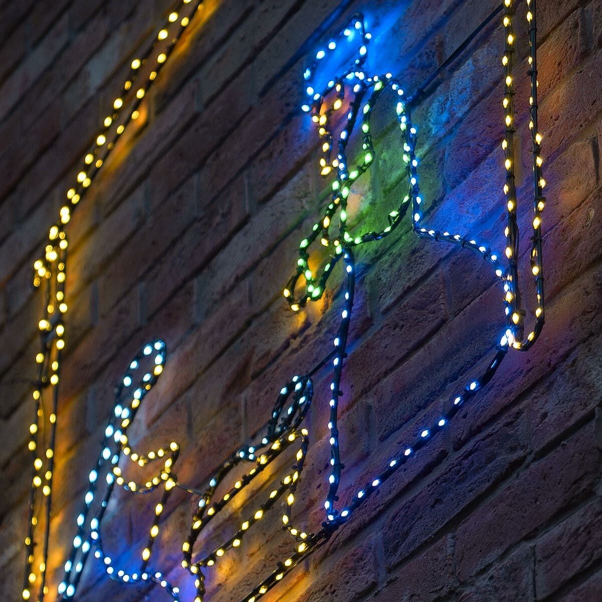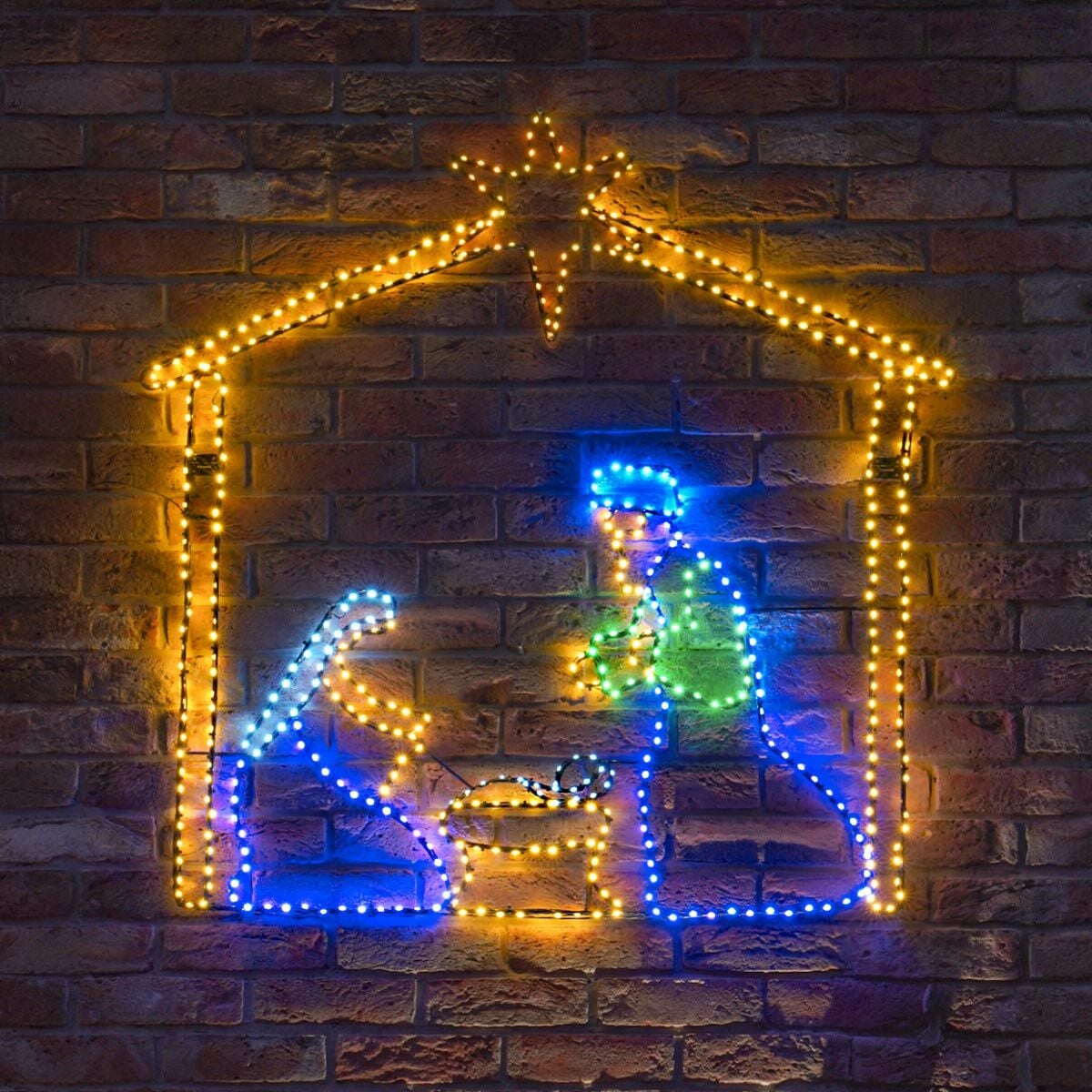 448 blue, green, purple, white and warm white flashing flexi wire LEDs bring the traditional nativity tale to life with a proud Mary and Joseph looking over the baby Jesus Christmas – the ultimate symbol of the season. With a subtle 3-pin stand gives you the freedom to position and stand this charming silhouette front and centre for all to see. Alternatively, why not opt for hanging this scene high and mounting it on the wall for some extra festive flair? Regardless of your styling, the generous 5m black lead cable length gives you ample room and opportunity to position this motif as pride of place within your Christmas display, be it indoors or out.