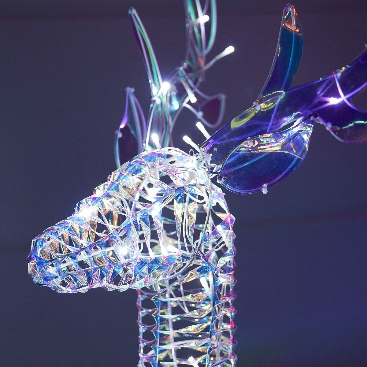 Standing at an impressive 85cm and 41cm in height, these PVC coated wired reindeer and sleigh are the ultimate Christmas decoration. 70 bright white LED lights shine brightly and reflect against the iridescent plastic that has been carefully wrapped and woven throughout the entire bodice.