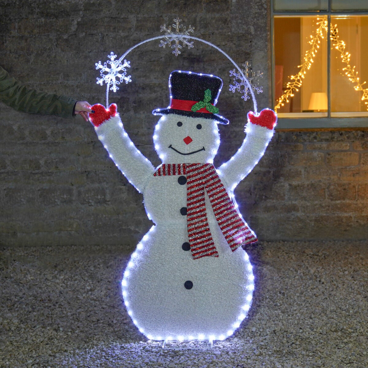 Made from a sturdy yet lightweight iron frame and stand, this free-standing frosty gentleman is surrounded by soft fabric all over his body and completed with 140 white LED bulbs. Standing at an impressive 1.5m in height, this festive decoration depicts a smiling wintery Snowman juggling a collection of snowflakes that Jack Frost himself would be proud of.