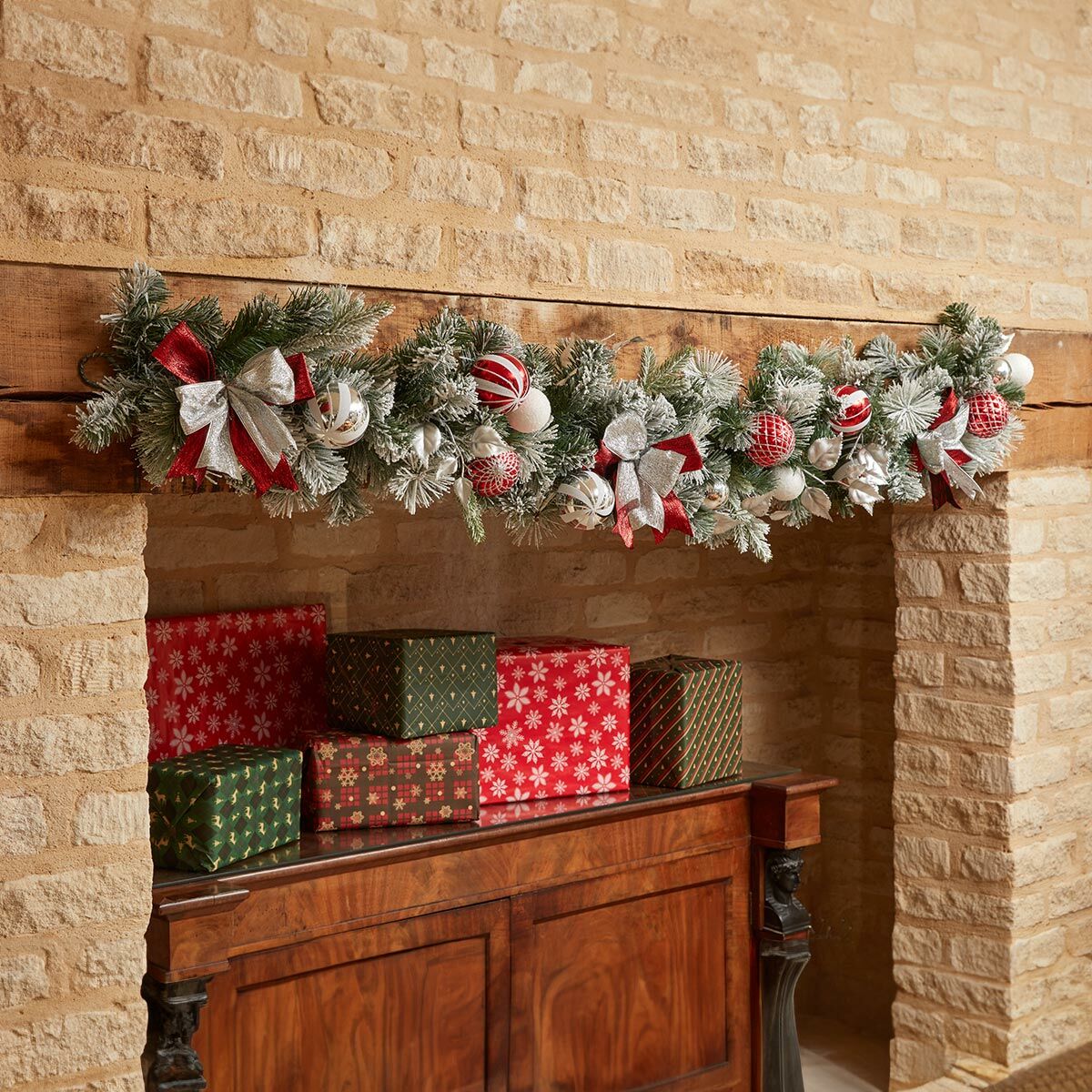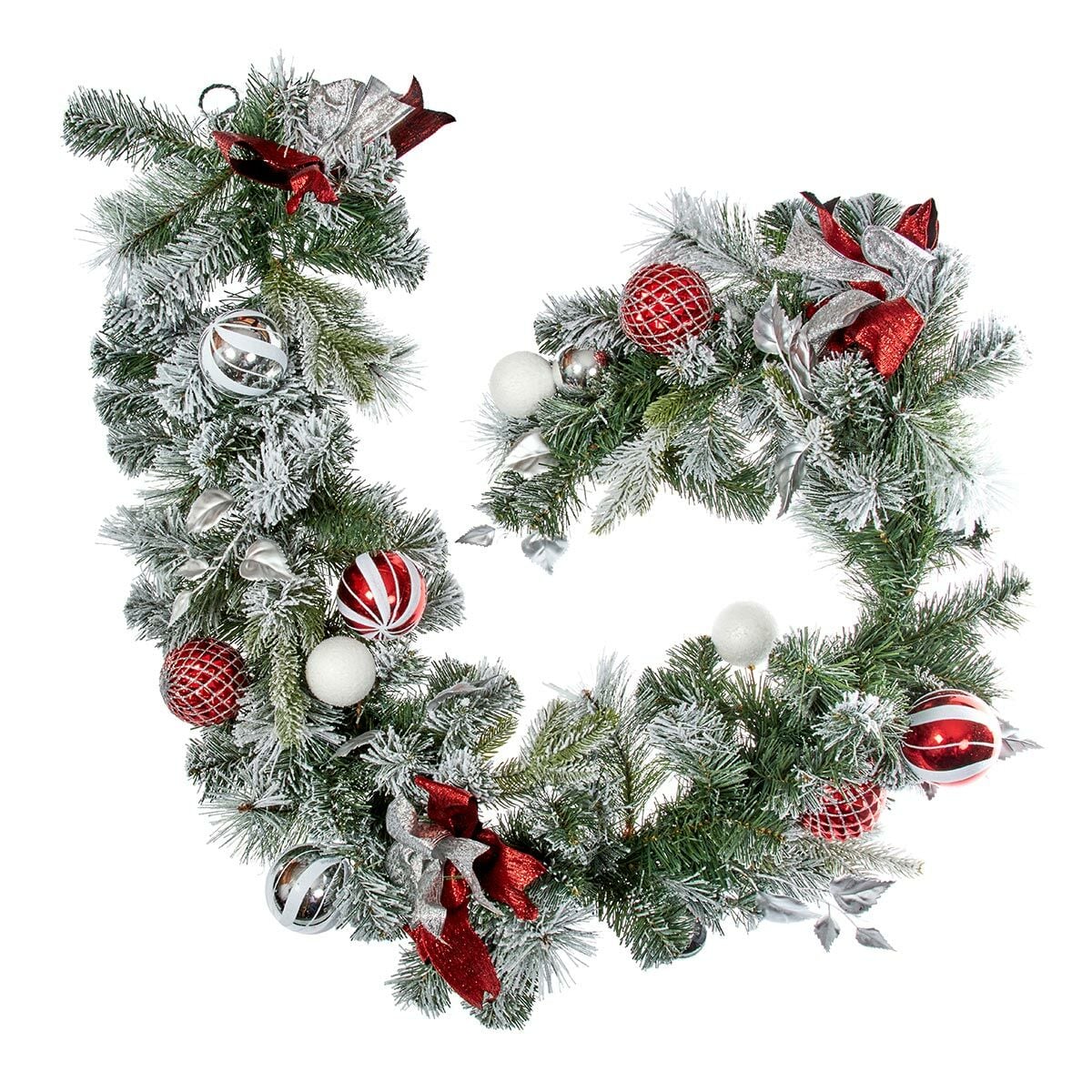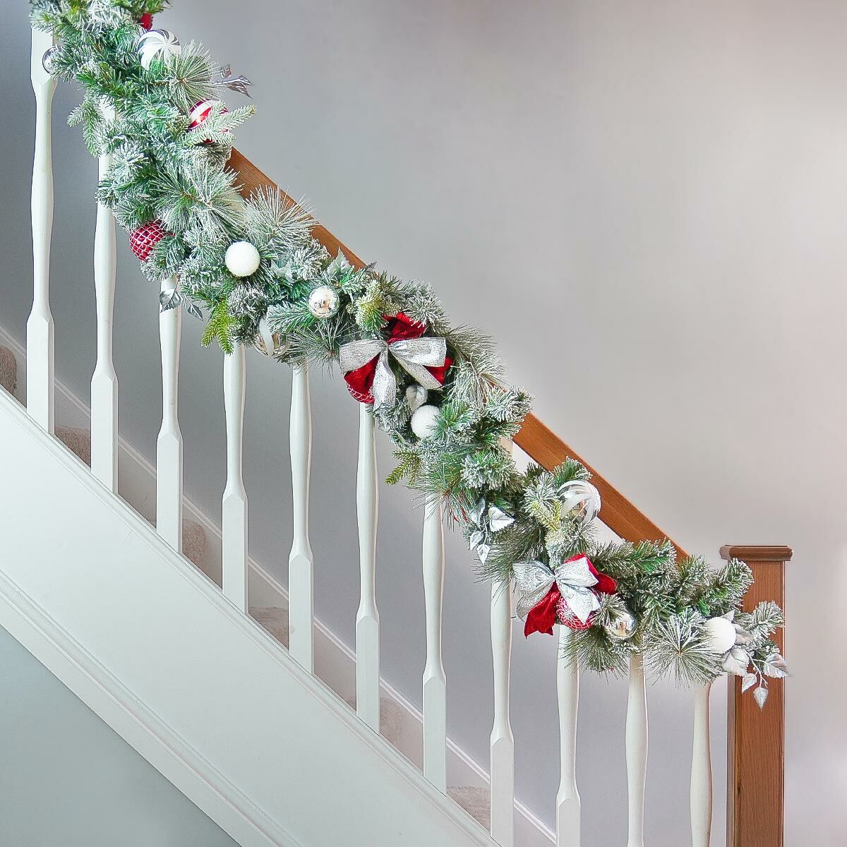 Treat your home this Christmas with this impressive 1.8m artificial garland. An accentuated take on the traditional ‘evergreen’, this garland looks as though it has been picked directly from a C.S. Lewis novel. The flocked pine needles have been surrounded with silver and red bows, glistening foliage and littered with red, silver and white baubles to create a traditionally festive finish. Perfect for intertwining between staircase spindles, draping over mantlepieces or hanging above your doorways, this frosty garland is the perfect finishing touch to a truly breathtaking display.