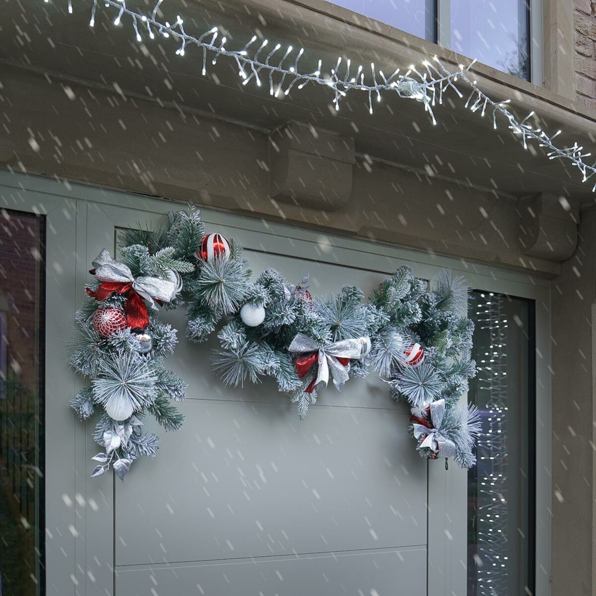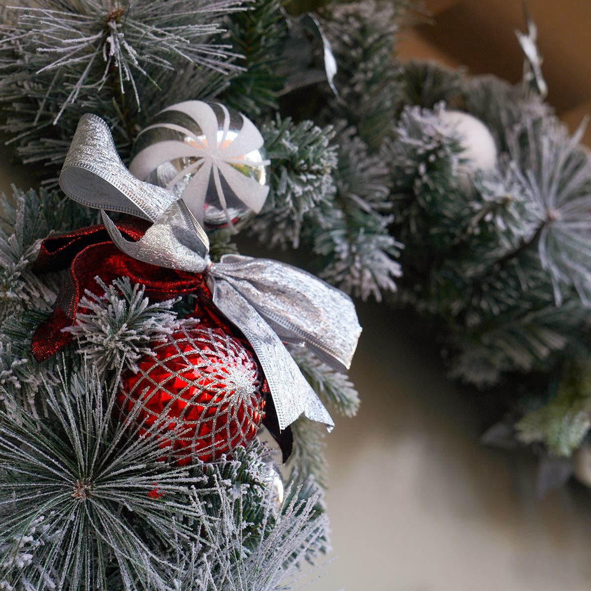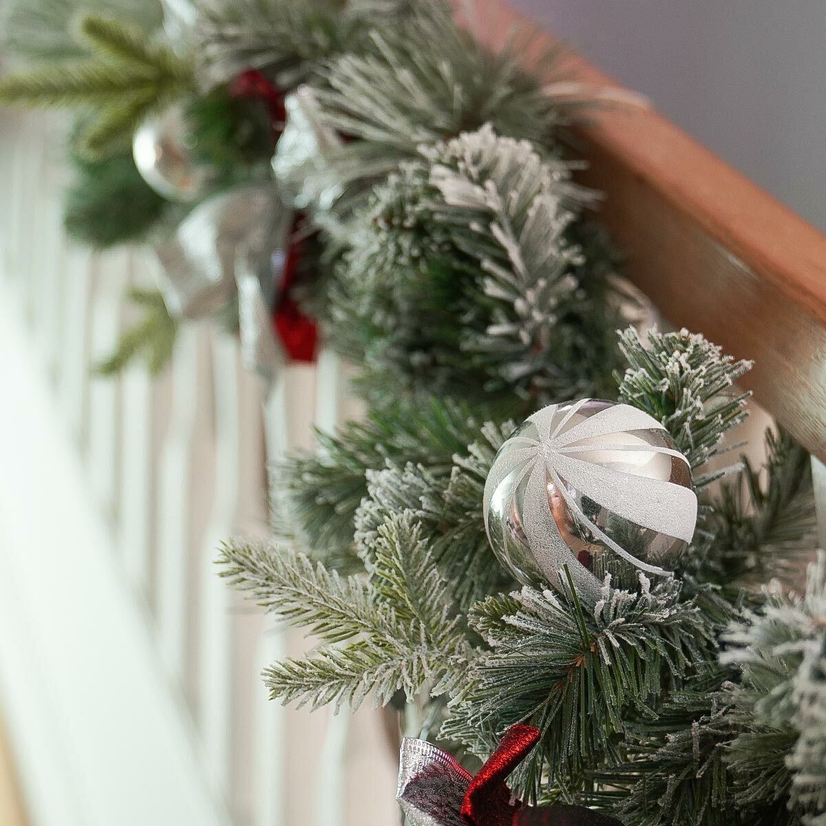 Treat your home this Christmas with this impressive 1.8m artificial garland. An accentuated take on the traditional ‘evergreen’, this garland looks as though it has been picked directly from a C.S. Lewis novel. The flocked pine needles have been surrounded with silver and red bows, glistening foliage and littered with red, silver and white baubles to create a traditionally festive finish. Perfect for intertwining between staircase spindles, draping over mantlepieces or hanging above your doorways, this frosty garland is the perfect finishing touch to a truly breathtaking display.