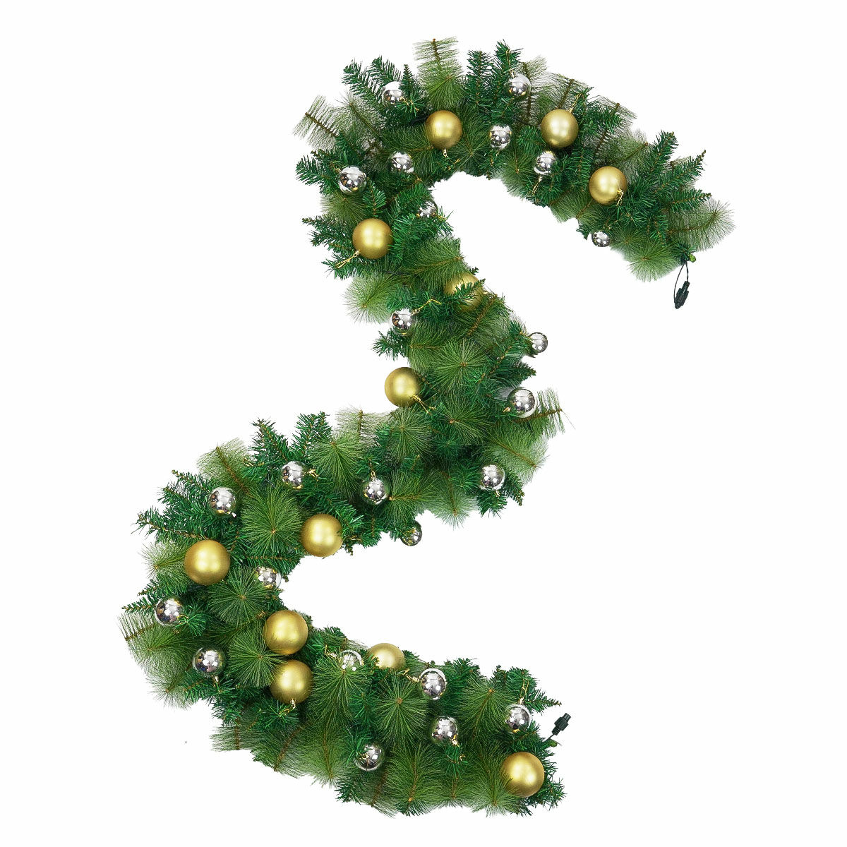 Make the ultimate Christmas statement with this standout ConnectGo® garland! This 3m long pine-inspired PVC garland has been carefully pre-decorated with a selection of gold and silver plastic baubles and intertwined with a string of 50 warm white LED bulbs that sit along a subtle green cable.