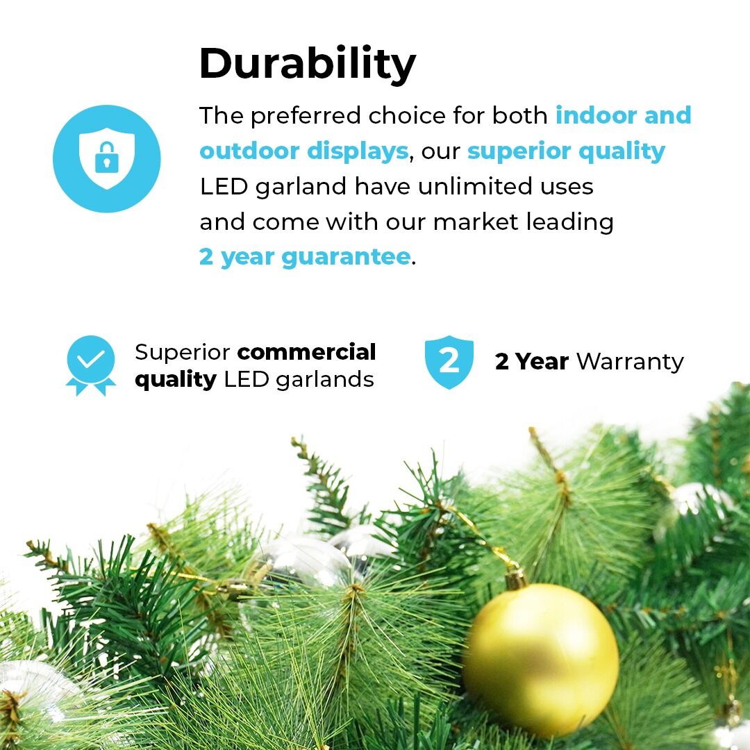 Guaranteed to instantly inject some much-needed Christmas cheer into your commercial or domestic display, this full-bodied garland is perfect for both indoor or seasonal outdoor use and comes with our market-leading 2-year guarantee. As a proud member of our ConnectGo® range, this garland has been designed with shaped wings for a reassuringly strong connection when connecting to other products within the range – simply look out for the blue ConnectGo® overlay, as each item with this logo can be connected to this traditionally festive garland.