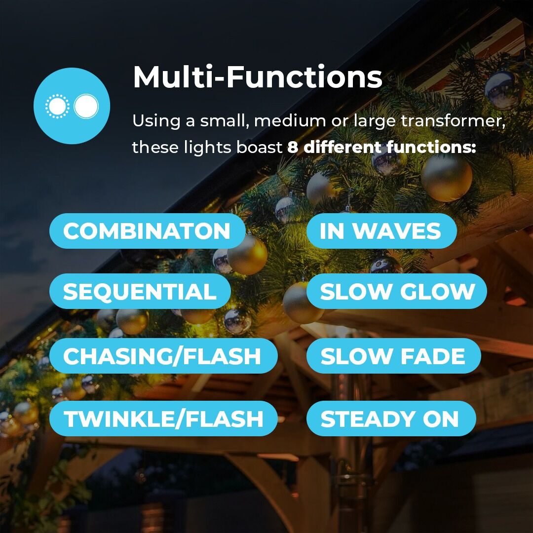 Using a small, medium, or large transformer, these lights boast 8 different functions including, combination, in waves, sequential, slow-glow, flash, slow fade, twinkling, and steady on. Each time you switch the lights on, the built-in memory chip will automatically select the last function used.