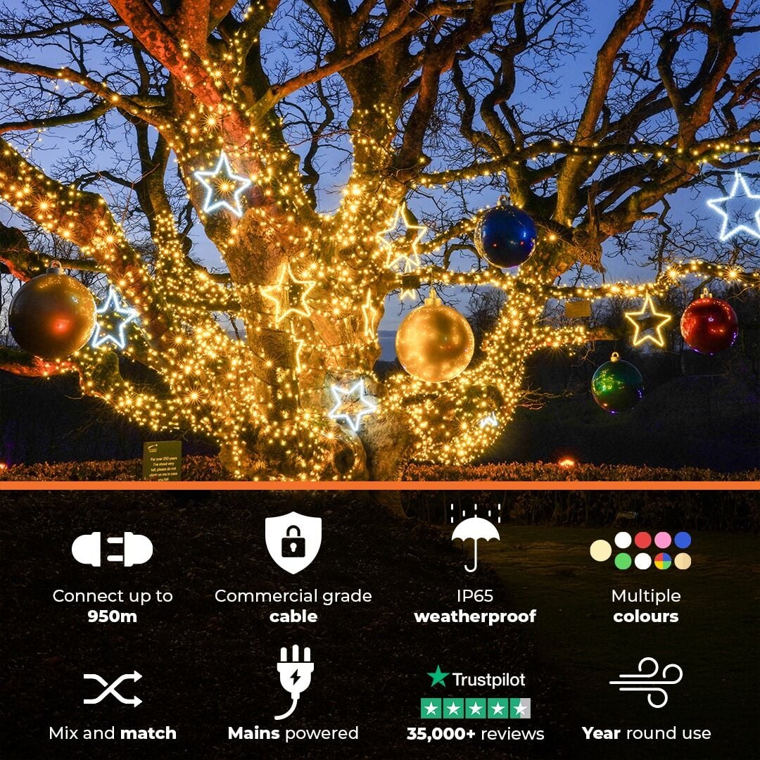 Look out for the orange ConnectPro overlay - every item with this logo can be connected to these lights. Choose between our expansive range of Fairy Lights, Icicles, Nets, Motifs, Reindeer and Curtains, all easily connected with our unique simple push and screw design.