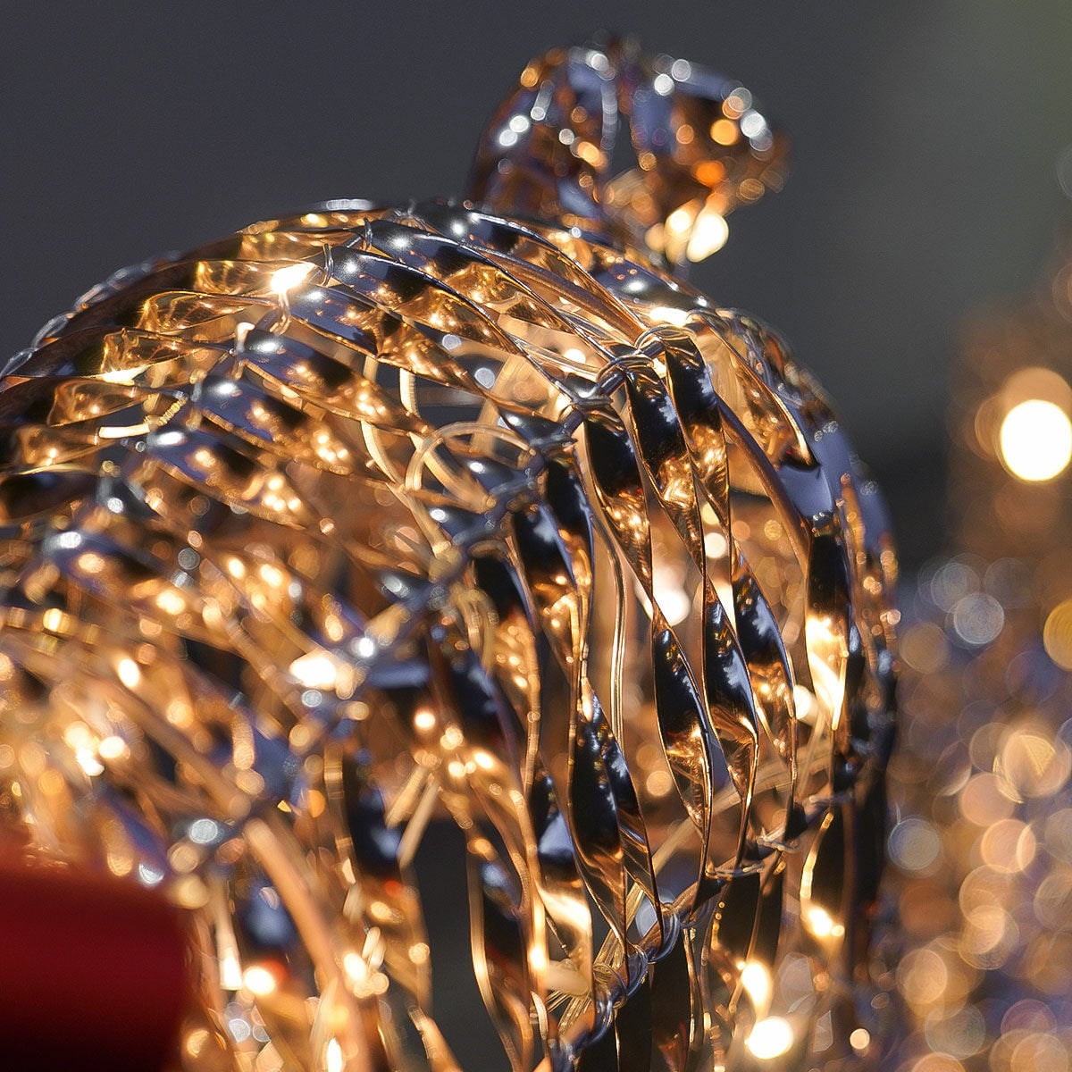 Standing at an impressive 85cm and 41cm in height, these PVC coated wired reindeer and sleigh are the ultimate Christmas decoration. 70 bright white LED lights shine brightly and reflect against the glistening rose gold plastic that has been carefully wrapped and woven throughout the entire bodice.