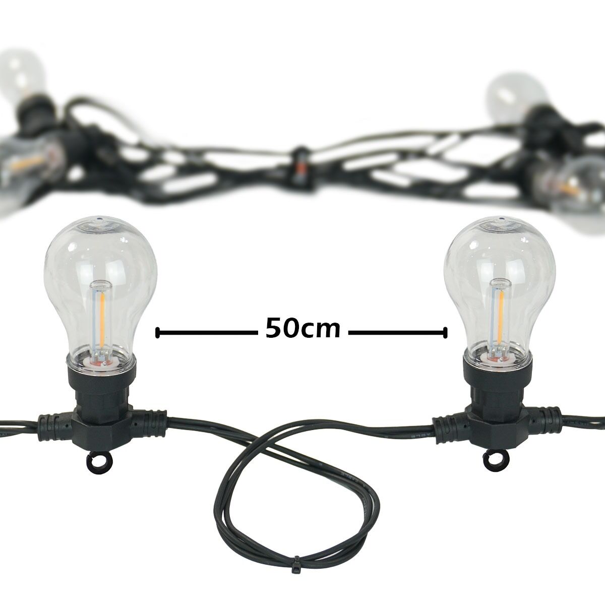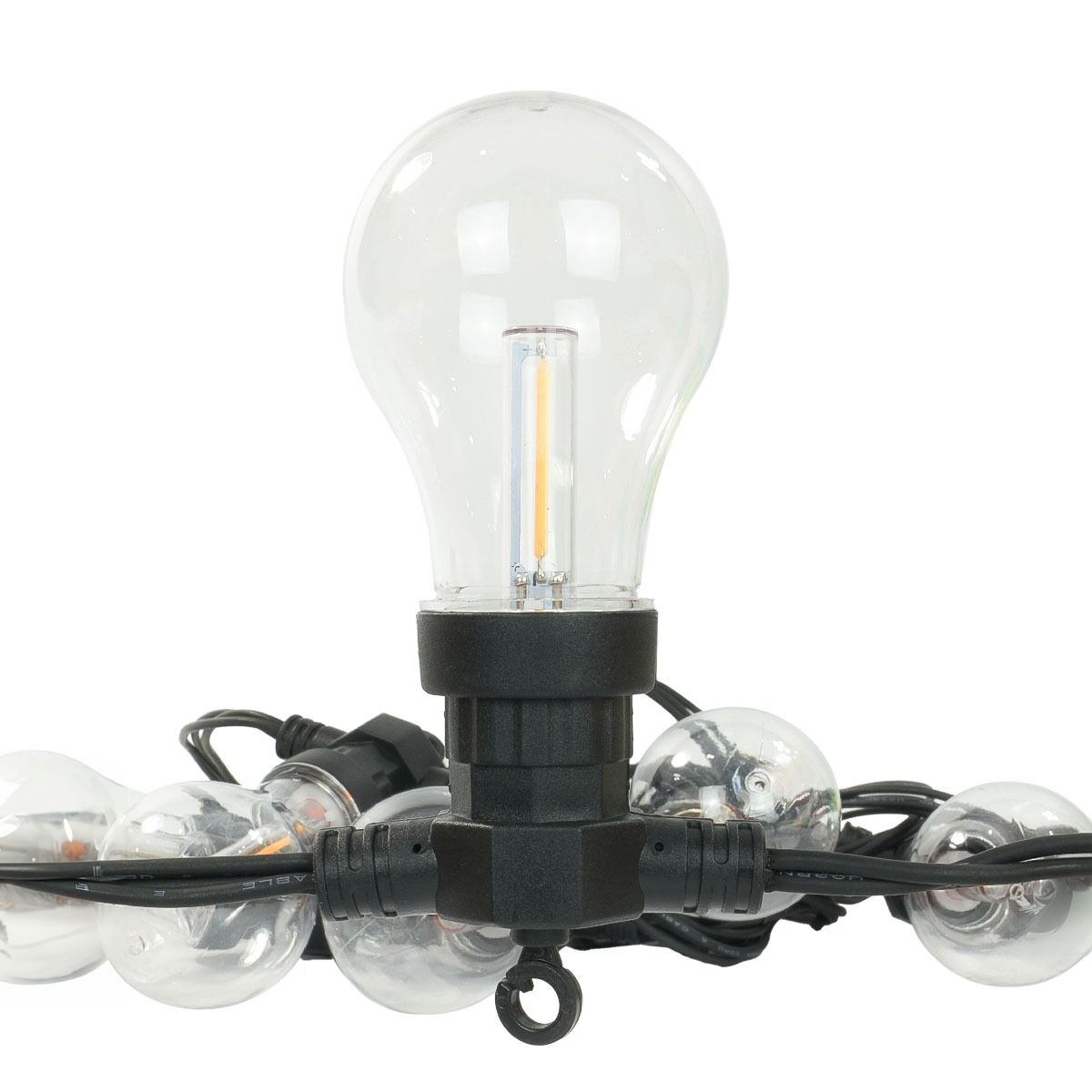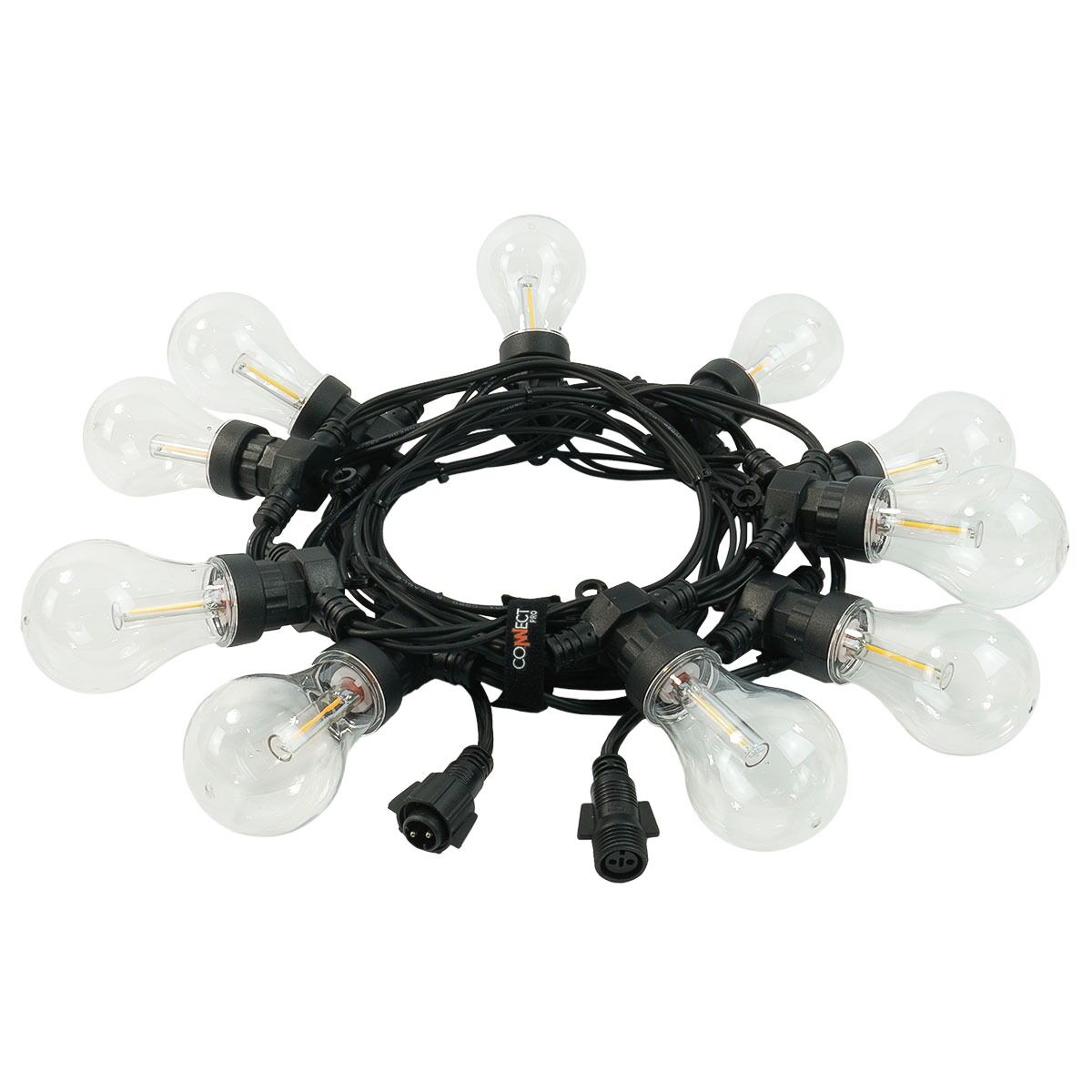 Perfect for illuminating bars, restaurants, beer gardens and pergolas, these bold filament style ConnectPro® festoons pack bags of character. 10 fixed traditional, A60 sized festoon caps sit along this 5m professional quality black rubber cable, each home to a warm white LED bulb.