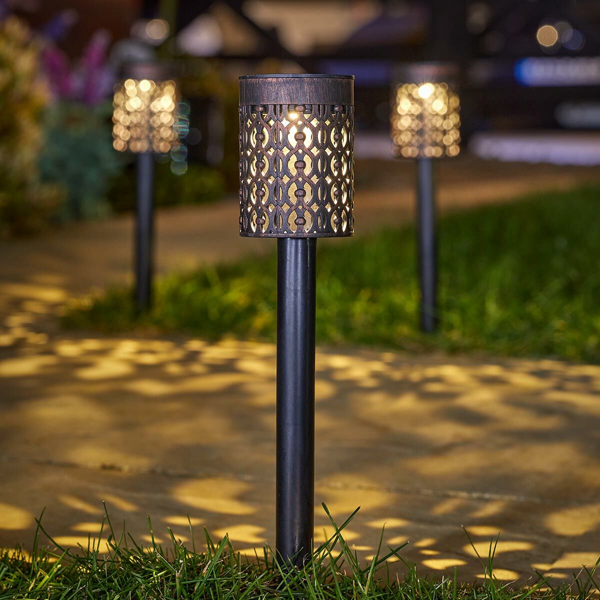 Each lantern, which has been brushed with a rustic bronze effect, houses 1 warm white LED bulb which shines brightly through the intricate laser cut Moroccan design, casting beautiful patterns along your patio and garden space.