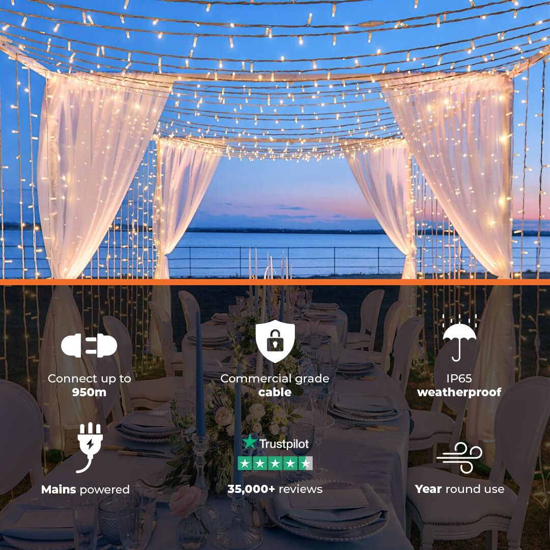 Our high quality LED string lights have unlimited uses; perfect for trees, fences, bushes, buildings and more. As part of our ConnectPro connectable lights system, from just one plug you can connect together multiple light strings to meet your required needs; saving you time, money and plug sockets.