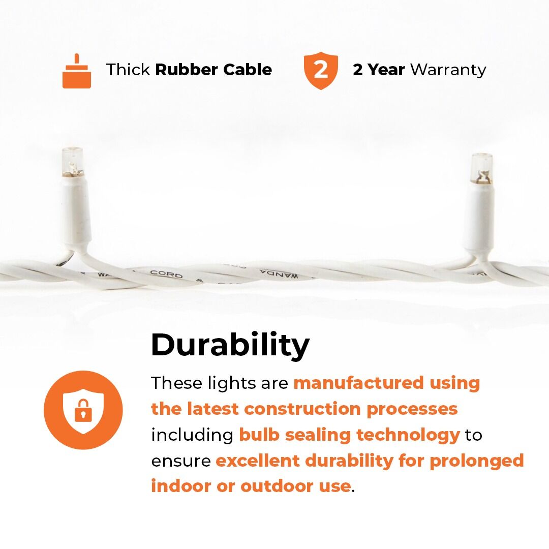 These commercial quality string lights, with warm white LEDs, feature a white rubber cable and come in connectable 3m lengths.