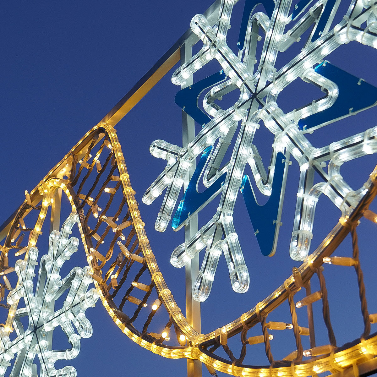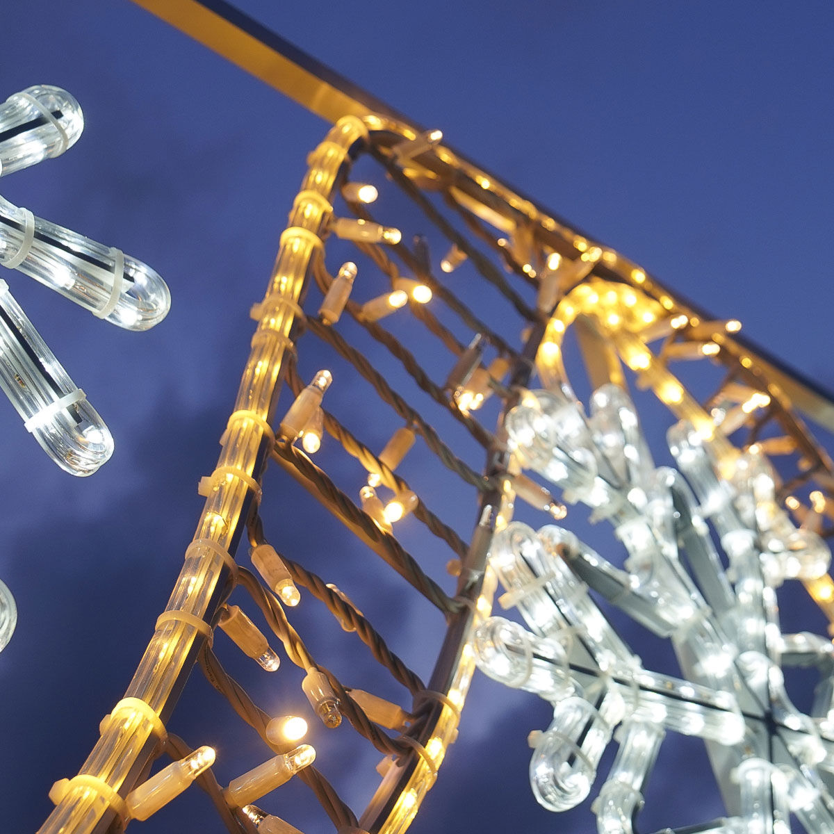 Perfect for positioning between lamp posts, this impressive motif depicts a dazzling frosty scene, with 6 bold and bright snowflakes intertwined with golden ribbon. The strong aluminium frame is home to a combination of our exclusive ConnectPro® rope lights and string lights – 1,276 LEDs within the rope light and 360 LEDs within the string lights – totalling an awe-inspiring 1,636 LED bulbs which twinkle brightly. Guaranteed to turn heads and illuminate spaces, this dazzling structure will instantly ramp up those frosty festive feels we all know and love.