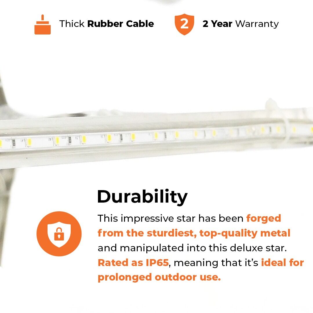 This impressive star is available in either white or warm white and has been forged from the sturdiest, top-quality metal and manipulated into this deluxe star. Rated as IP65, meaning that it’s ideal for prolonged outdoor use, this star has been lined with our exclusive ConnectPro Strip Lights and is home to 540 dazzling LEDs which will shine brightly in contrast against the dark night sky.
