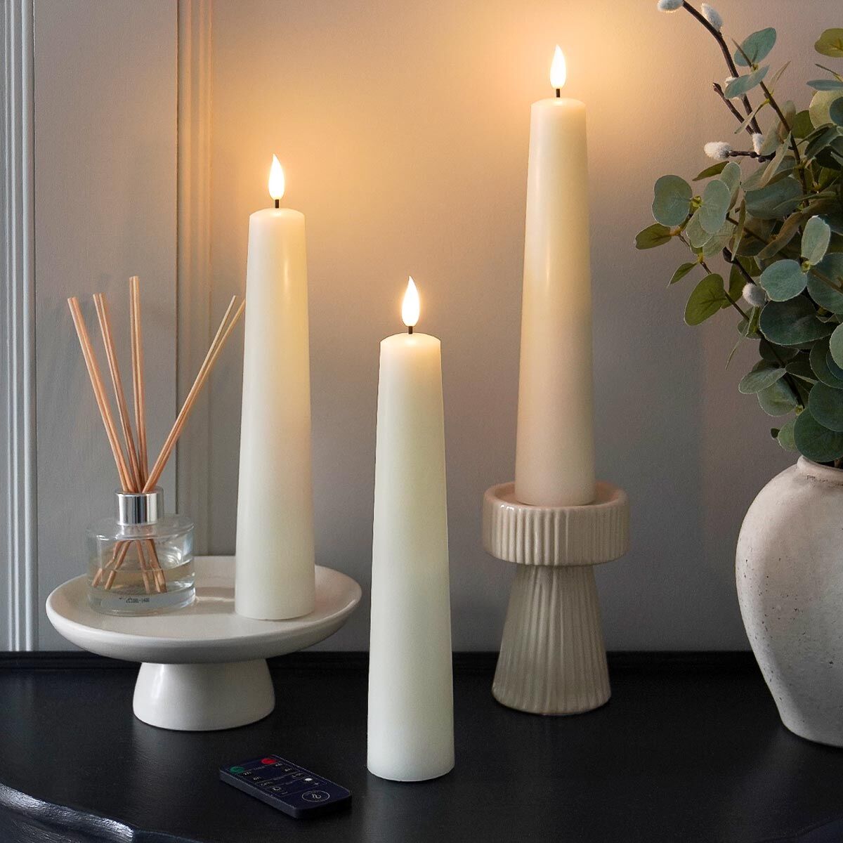 A discreet switch below the base gives you full control, offering on, off and 6hr timer settings. Set the timer and the candle will glow for 6hrs, then turn off automatically for 18hrs, repeating this cycle each day without you ever having to lift a finger. They’re also remote control compatible, offering even more convenience when paired with the Ember™ remote (sold separately). The battery compartment is secured with a subtle screw to ensure safety and peace of mind, especially in busy family households. And thanks to C type battery operation, these candles shine brighter and longer than most AA-powered alternatives – perfect for extended seasonal displays.