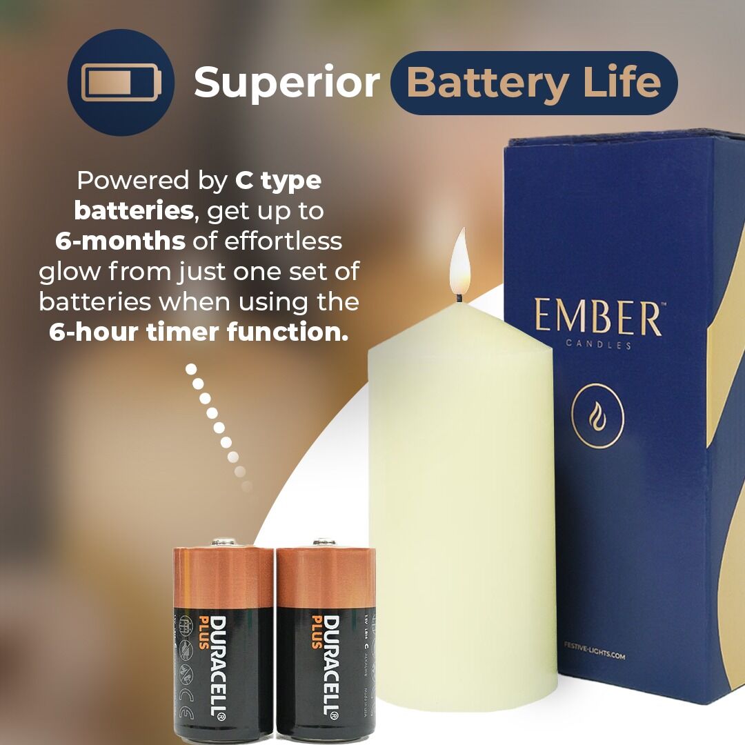 Powered by C-type batteries, our Ember Candles™ are brighter and longer-lasting than any other competitor on the market. The weighted, real wax eludes luxury and authenticity while the flickering flame emits a soft yet bright glow that releases the desired relaxing, laid back atmosphere expected from a real candle.