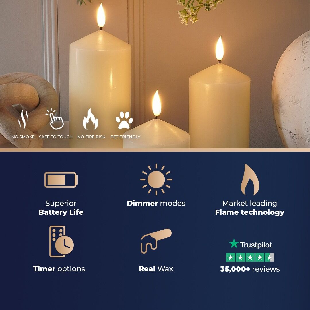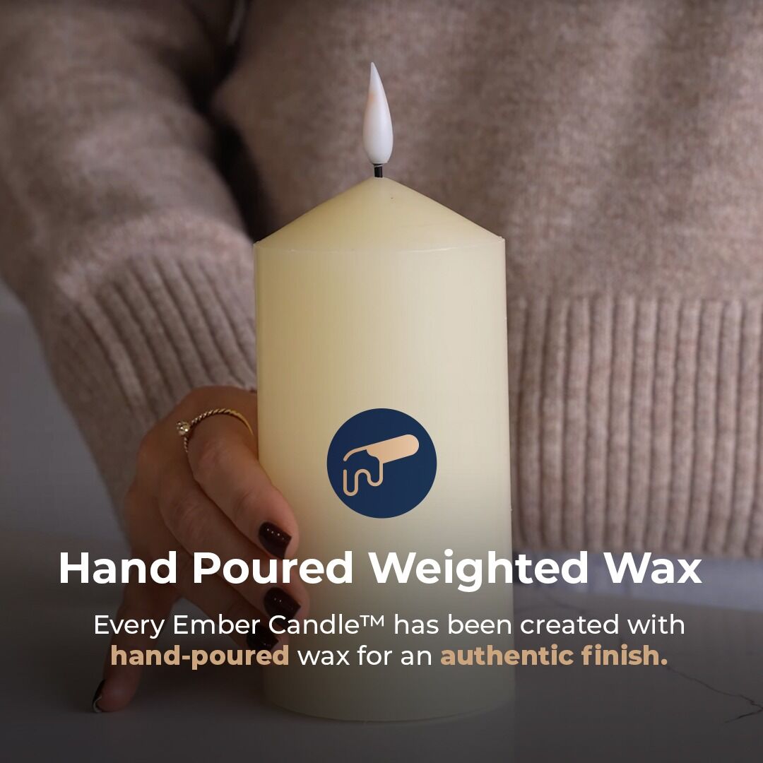 Perfectly safe to use around children and animals thanks to the cool-to-touch LED, these classic cream, ivory Chapel candles are ideal for adding a warm, welcoming glow in and around your home. The discreet battery pack has been secured in place with a screw, ensuring no risk of batteries ever falling out, and the simple switch makes these candles easy to use. The handy 6-hour timer function gives you peace of mind knowing your Ember Candle™ will switch on and off at the same time night after night.