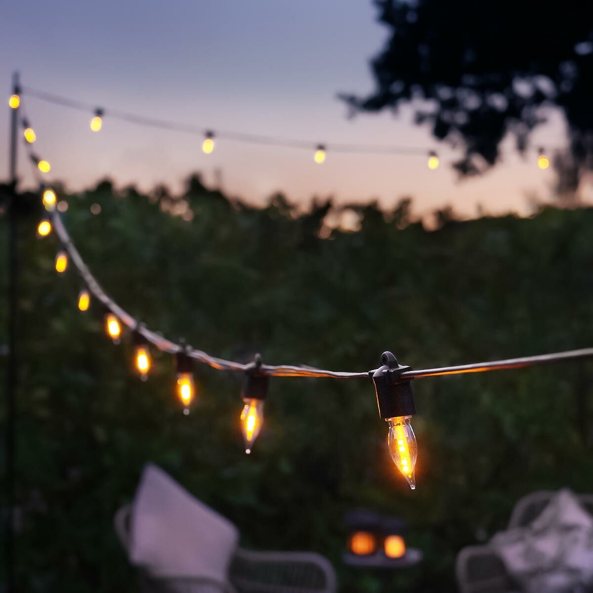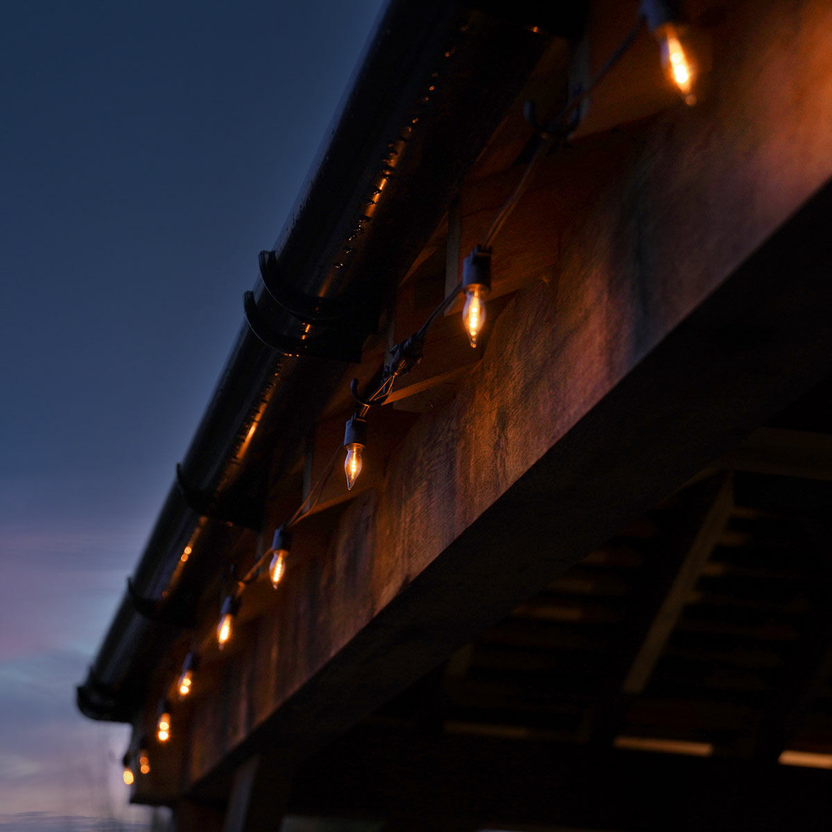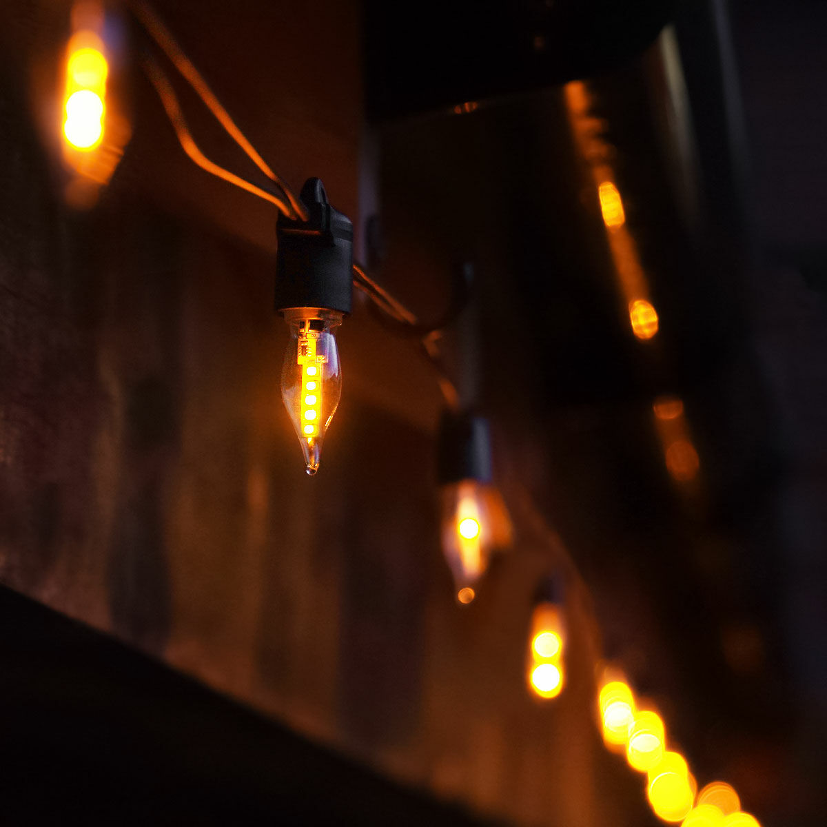 Each 5m durable black rubber cable features 12 ‘flame’ bulbs, each secured into robust sockets complete with hanging hooks. Each screw-in bulb is home to 10 warm white SMD LEDS, meaning a single 5m length features a total of 120 SMD LEDs, which will shine brightly, alternating in pattern to mimic a flame-like illusion within the plastic casing.
