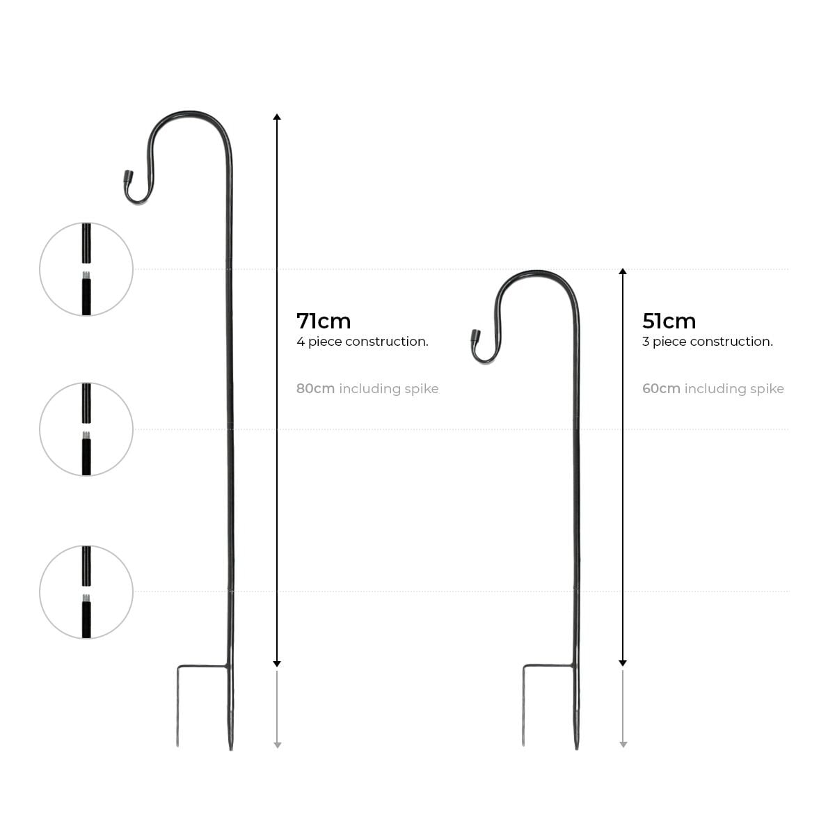 - 3-Part construction: 60cm (H) Including spike. 51cm (H) Excluding spike.