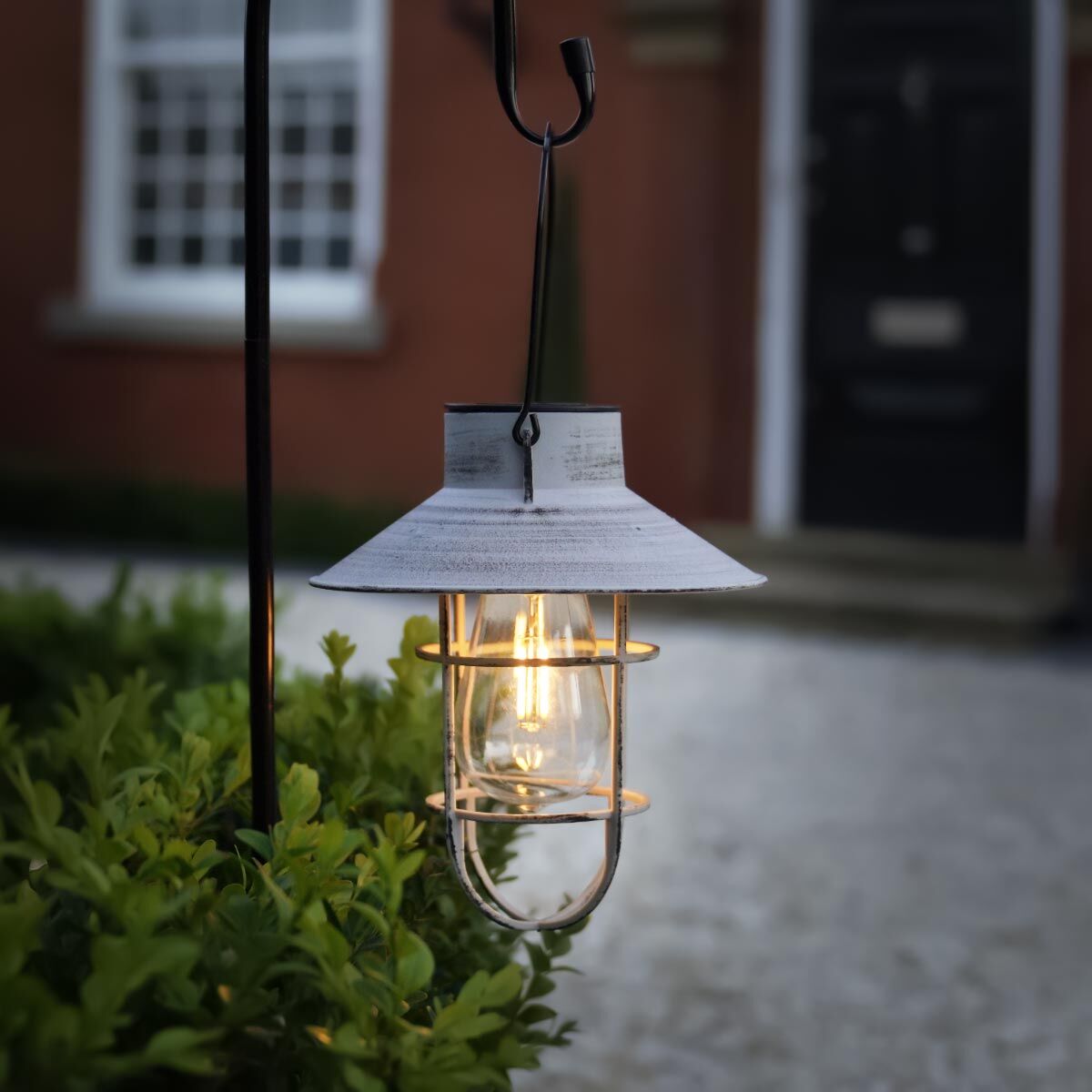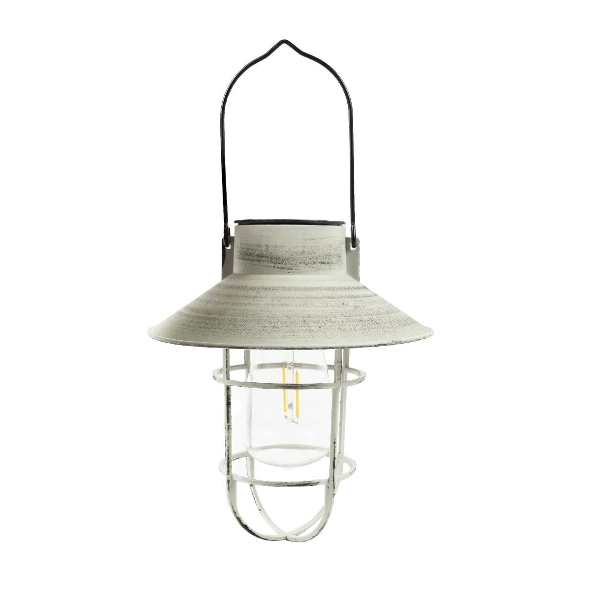 The filament effect lantern is solar powered and comes with an attached handle, meaning it couldn't be easier to hang from the black, metal shepherds hook. The lantern is constructed from durable plastic and robust metal and contains an integrated solar panel that's housed on top of the lantern. The panel is powered by 1 x AAA Ni-Mh 1.2v/300mAh battery, which is charged by sunlight and lights up a warm white LED that sits inside the filament effect bulb.
