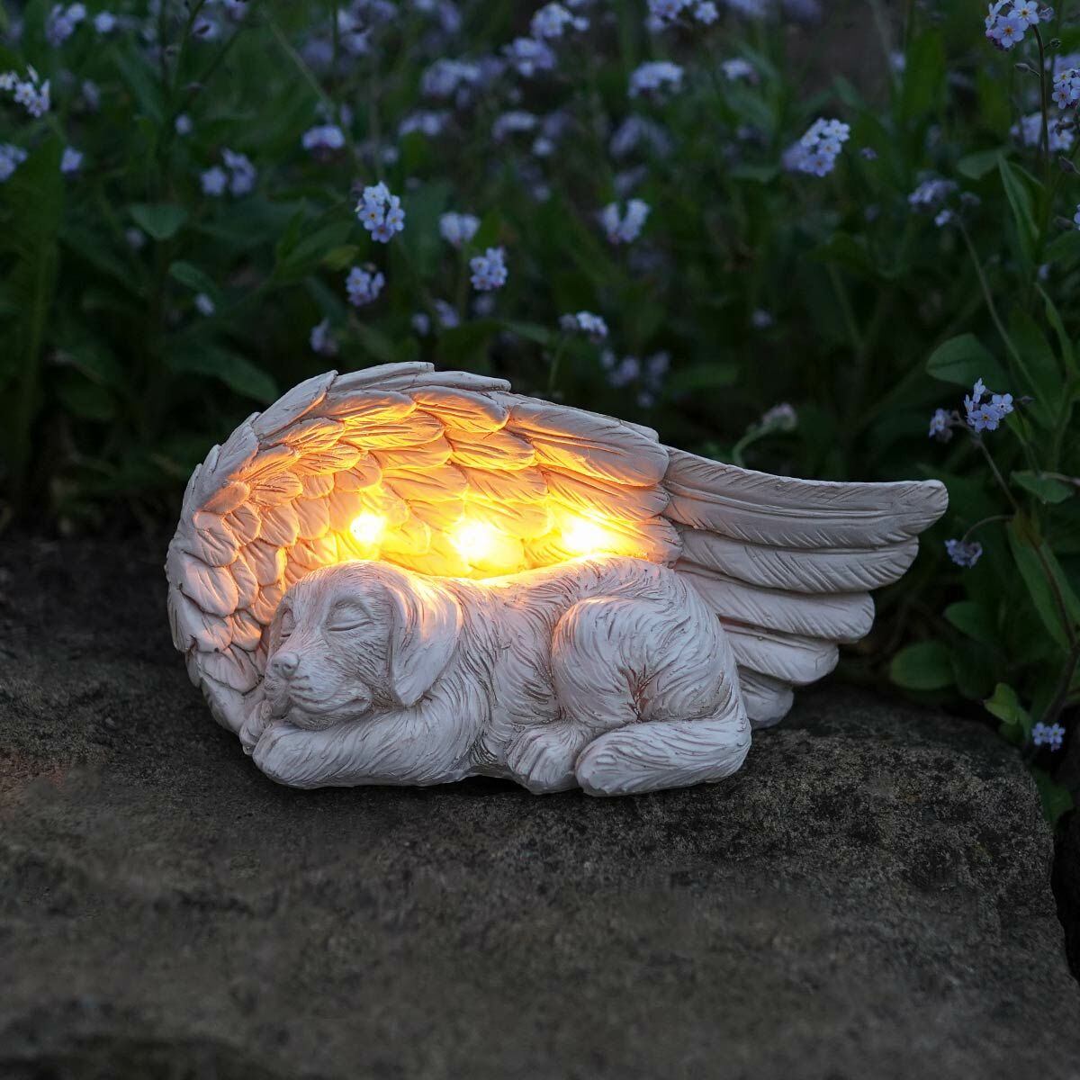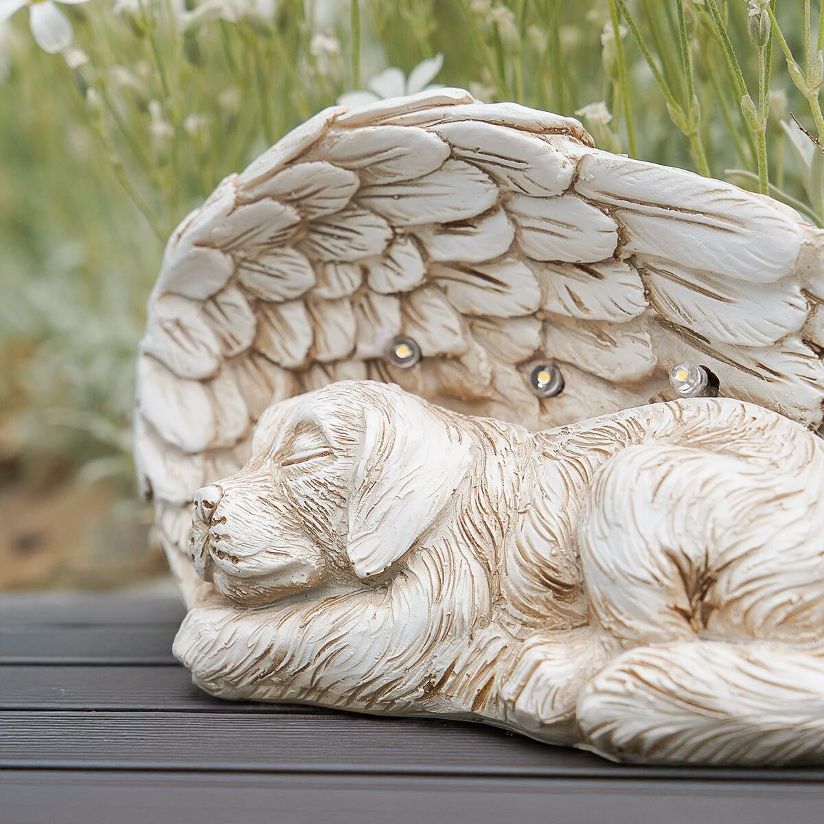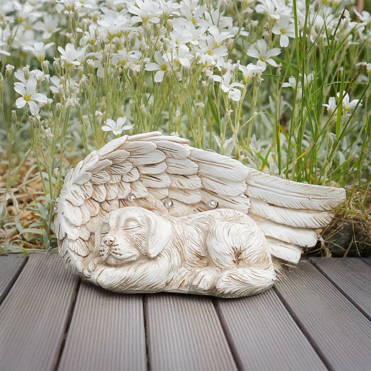 Featuring a peaceful dog, resting peacefully, basking in the warm glow of the lights positioned delicately on the wing decoration. This charming token of remembrance is manufactured from high quality, durable, weather-resistant resin, making it perfect for outdoor use, year after year.
