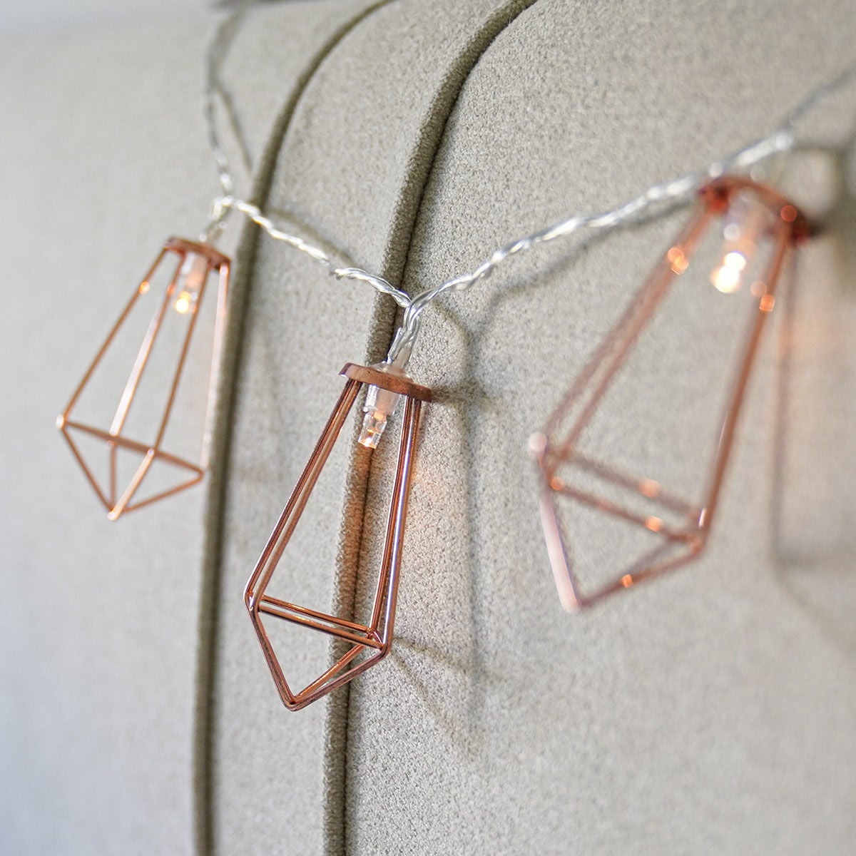 With 10 dainty lanterns spaced 15cm apart, you can easily make a style statement around your home whilst the warm white LEDs emanate a soft static glow through the rose gold cage. Perfect for in the living room or draped over a bedstead or dressing table in the bedroom, these small yet mighty lights look impressive embellishing displays around your home. They also make ideal decoration for weddings, injecting a warm romantic light to table centerpieces.