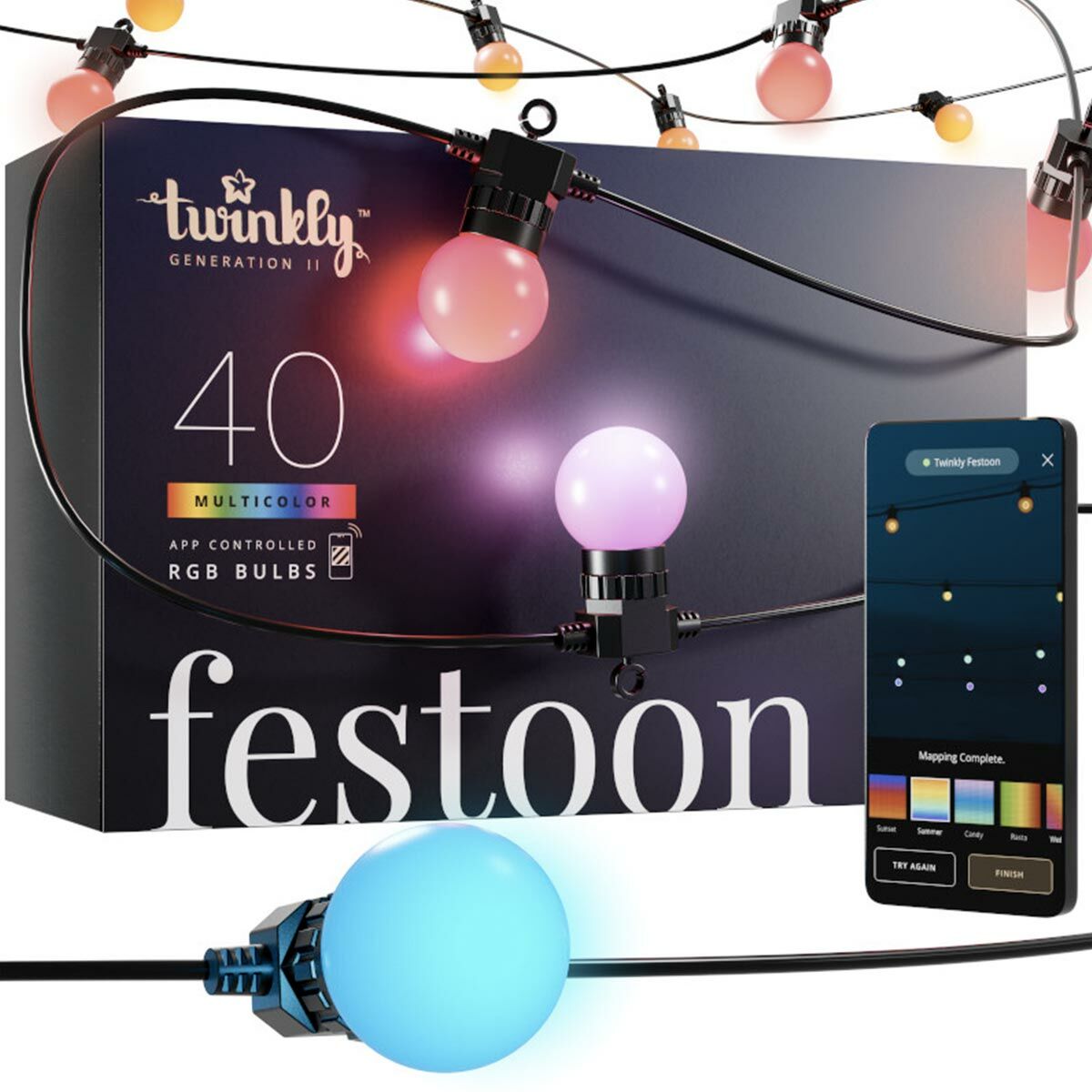 Create dazzling custom light displays with Twinkly’s smart RGB festoon lights. App-controlled, colour-changing LEDs with advanced mapping, animations, and voice assistant compatibility.