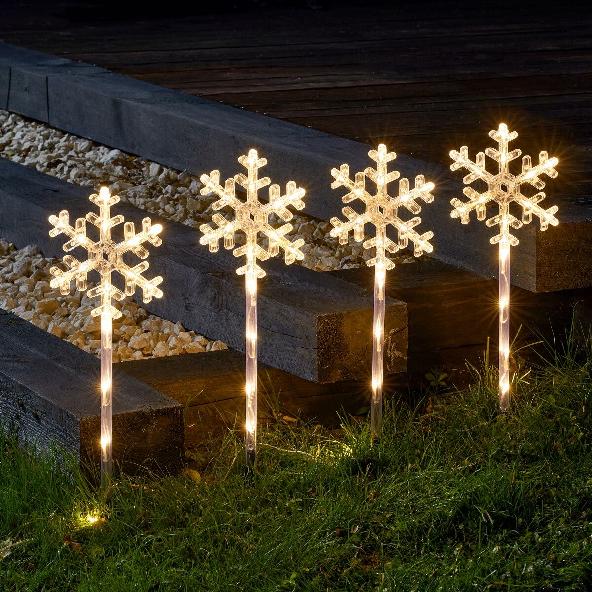4 Warm White Outdoor Battery Snowflake Christmas Light Stakes 43cm